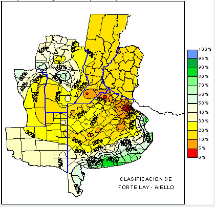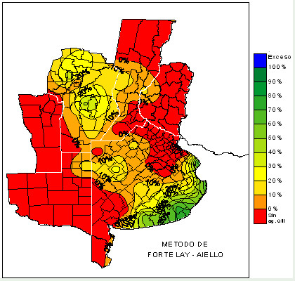 Considerar en sequía absoluta las áreas con 0% de agua útil, en sequía condicional las áreas entre 0 y 50% de agua útil y en humedad óptima las áreas entre 50 y 100% de agua útil.