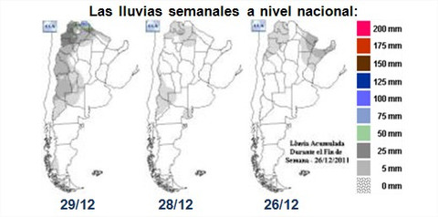 Desde el jueves 22 de diciembre, se desarrollaron precipitaciones débiles y aisladas sobre la región GEA. Los acumulados varían significativamente presentando un núcleo con un acumulado semanal superior a los 20 mm concentrado en la franja este de Santa Fe. El registro más importante lo encontramos en Irigoyen (Santa Fe), con un acumulado semanal de 32,4 mm. El resto de la región recibió lluvias, pero inferiores a los 5 mm, lo que sigue agravando el déficit hídrico en toda la región. Sólo atenuó la mayor demanda atmosférica la menor temperatura, sensiblemente inferior en este período frente al anterior.