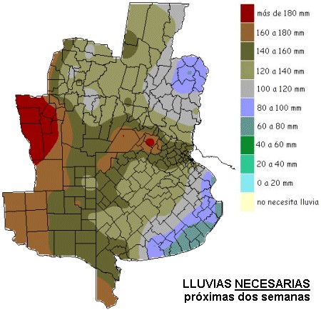 En el mapa que muestra la demanda de lluvias necesarias para recuperar el perfil y cargarlo hasta lograr valores adecuados de humedad, resalta la zona núcleo como el corazón de la zona deficitaria. Las lluvias necesarias se ubican por encima de los 150 milímetros. Es decir se requiere un evento anómalo para revertir el estado actual o al menos un evento que entregue en forma generalizada 50 milímetros. De concretarse esta hipótesis se pondría temporariamente un freno al deterioro del maíz y se evitarían mayores pérdidas, las cuales por zonas ya son irreversibles. De más está decir que para las sojas sería la salvación.