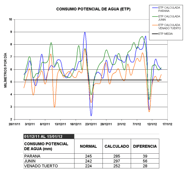 La figura adjunta muestra los valores de consumo diario potencial (evapotranspiración potencial o ETP) estimado para una pastura de referencia desde diciembre hasta la actualidad en tres localidades. La línea horizontal negra muestra el valor medio o climático para este periodo.