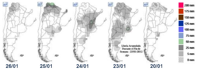 Las precipitaciones alcanzaron generalizadamente la región núcleo luego de repetidos días en que las marcas térmicas fueron extremadamente elevadas, con promedios que se mantuvieron entre los 36 y los 40°C, muy por encima de los parámetros normales para el mes de enero. Entre los acumulados más importantes de la semana, se destaca Rojas (Buenos Aires), con 103,6 mm. El resto de GEA recibió montos que variaron entre 20 y 60 mm.