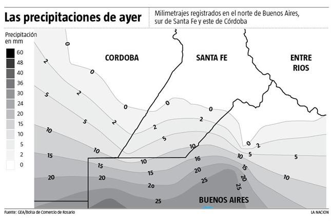 Así, mientras en Junín se registraron 45 milímetros, en localidades como Venado Tuerto cayó sólo un milímetro. Más fuerte fue la diferencia en Córdoba: mientras la capital mediterránea fue azotada por un fuerte temporal, en el este provincial, netamente agrícola, las precipitaciones fueron escasas o nulas.