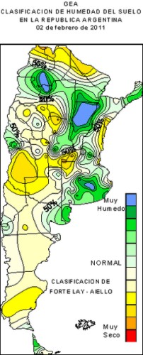 Esto es reflejado a nivel nacional en el reciente mapa de humedad del suelo en el país al primero de febrero muestra claramente las deficiencias en el centro de la región pampeana y las mejoras en zonas del centro de Buenos aires, norte De Córdoba y buena parte de Santiago del Estero.