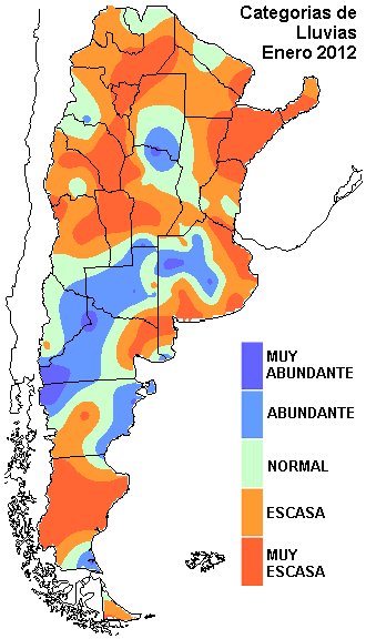 La comparación de los registros observados con los valores medios del mes de enero (1973-2011), permiten configurar el mapa de categorías de lluvia. La franja de lluvias escasas dominante en la zona núcleo se interrumpe alcanzando valores normales o abundantes al desplazarnos hacia el oeste de BA o la provincia de LP. Desde la bahía de Samborombón hasta Trenque Lauquen, es decir prácticamente en una misma latitud, se puede apreciar un gradiente en las precipitaciones donde quedan contenidas todas las categorías de la escala. El campo pluvial es más parejo en el déficit en todo el ámbito del NEA, la Mesopotamia y gran parte de SF. En las zonas agrícolas del NOA se han observado muchas jornadas de lluvia pero en general con milimetrajes bajos, exceptuando el norte de Salta. Han sido abundantes las lluvias en la transición entre Córdoba y Santiago.