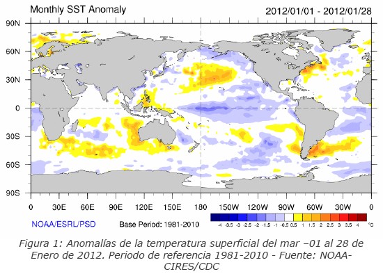 El Índice Oceánico de El Niño - promedio móvil de tres meses de la anomalía de la TSM sobre la región Niño 3.4 – es negativo desde el trimestre mayo-julio de 2010. Luego, en el verano 2010/2011 comenzó a aumentar y llegó a 0ºC en mayo-julio de 2011, a partir de julio-septiembre comenzó a disminuir nuevamente. En el trimestre noviembre - enero quedó con un valor de -0.9ºC.