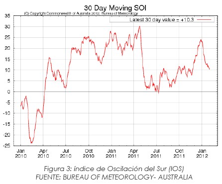 El IOS de 30 días se mantiene positivo desde mediados del mes de julio de 2011, entre agosto y noviembre no presentó grandes fluctuaciones. Después del aumento observado en diciembre, en enero comenzó a disminuir. El promedio móvil que termina el 30 de enero quedó con un valor de +10.3. Por otro lado la actividad convectiva se mantuvo inferior a la normal entre 150ºW y 160ºE aproximadamente, fue superior a sus valores normales en Indonesia y noroeste de Australia y fue cercana a la normal en el norte y noreste de Australia.