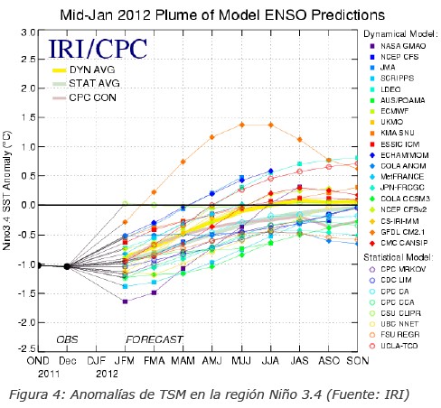En cuanto a la evolución del fenómeno ENOS para los próximos tres meses, la mayoría de los modelos dinámicos y estadísticos prevén anomalías de TSM inferiores a sus valores normales en el Pacífico central-oriental, lo cual es acorde a la predicción de una fase Niña. En particular para la región Niño 3.4, las anomalías de TSM pronosticadas para el trimestre febrero-abril (FMA 2012) oscilan entre -1.5°C y +0.2°C (Figura 4).