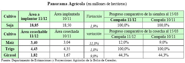 Al 15 de marzo, según el Panorama Agrícola Semanal, se ha dado comienzo a la cosecha de la la campaña 2011/2012 de maíz, registrándose un avance del 12,0%.