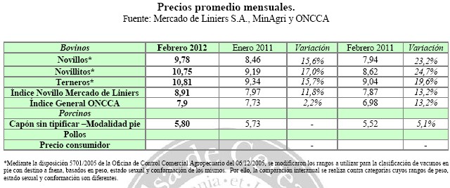 Precios de las carnes. Para la vacuna, los precios con respecto al mes pasado presentaron las siguientes variaciones: para las categorías novillos (15,6%), novillitos (17,0%) y terneros (15,7%).