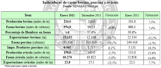 Indicadores de carne bovina, porcina y aviar al mes de enero. La producción de carne bovina se mantuvo en el mismo nivel con respecto al mes anterior y las exportaciones presentaron un incremento del 24,7% con respecto al mismo período.
