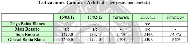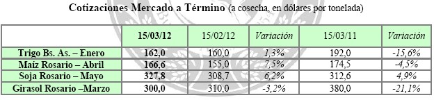 Las cotizaciones del mercado a término para el mes de cosecha presentaron las siguientes variaciones con respecto al mes anterior: trigo 1,3%, maíz 7,5%, soja 6,2% y girasol -3,2%.