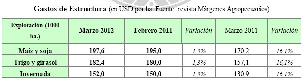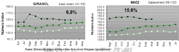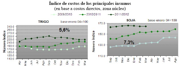 Los costos directos de los cuatros cultivos, con respecto al mismo mes de la campaña anterior presentaron las siguientes variaciones: maíz (+15,6%), soja (+7,3%), trigo (+5,6%) y girasol (+6,9%).