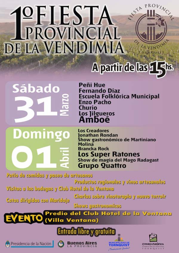 El sábado 31 de marzo y domingo 1 de abril se realizará la 1º Fiesta Provincial de la Vendimia en el predio del Club Hotel de la Ventana, ubicado en la localidad de Villa Ventana.