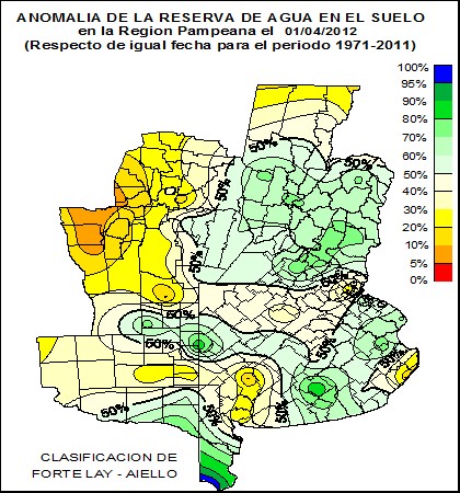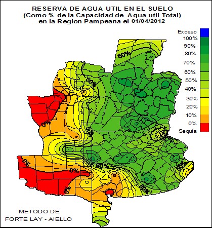 RESERVA DE AGUA ÚTIL EN EL SUELO (como % de la capacidad de agua útil total) en la Región Pampeana el 01 de Abril de 2012