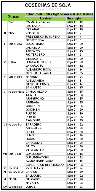 Otra de la zonas que denota un fuerte avance es el Centro-Norte santafecino, el cual registra rendimientos variados que oscilan entre los 25 y los 55qq/ha. A su vez, el Centro-Este entrerriano alcanza el 45% de la superficie apta cosechada. A pesar de la falta de agua durante un periodo prolongado en el mes de diciembre, sumado a la problemática existente en esta zona con la paloma y las cotorras, presenta en muchos casos rendimientos que superan las expectativas que tenían los productores antes de que ingresaran las maquinas al campo.