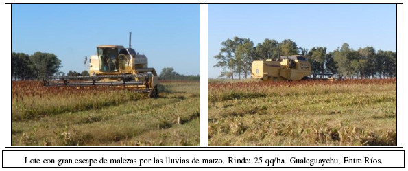 El resto de la zona aguarda por la colecta de los cuadros implantados de manera tardía, los cuales se perfilan, en muy buenas condiciones, aportar productividades similares o superiores a los rindes históricos. Diferente es el panorama en la zona Sur de Córdoba, donde recién comienzan a trillar los primeros lotes con productividades algo inferiores a las anteriormente mencionadas. A pesar de esto, el cultivo de sorgo demuestra que fue el mejor cultivo que respondió ante la seca generalizada que afecto la región.