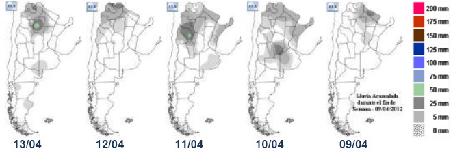 Durante la semana se registraron precipitaciones muy importantes sobre el noroeste de la provincia de Buenos Aires mientras que, en el resto de GEA, fueron aisladas, con acumulados inferiores. Las más significativas se desarrollaron sobre la provincia de Buenos Aires, donde se observa un núcleo que se destaca frente al resto de la región, con montos de más de 80 mm, como el que fue registrado en la localidad de Gral. Villegas donde el total semanal fue de 80,4 mm, los que interrumpirán por algunos días las labores de cosecha.