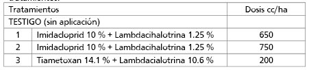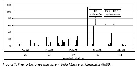 La aplicación de los insecticidas se realizó con mochila de gas carbónico a presión constante, con barra de 4 picos provistos de pastillas cono hueco, con un volumen de caldo de 180 l/ha. La fecha de aplicación de los tratamientos fue el 15/03/09 con el cultivo en R5.