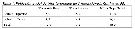 Población inicial: Se determinó la población inicial de trips al momento de la aplicación de los tratamientos. La unidad de muestreo fue el folíolo y las observaciones se efectuaron sobre el estrato superior e inferior de la planta registrando larvas y adultos, sobre una muestra de 10 folíolos de cada estrato y de cada repetición.