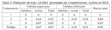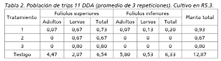 Evolución de la población: a los 11 días de aplicados los tratamientos, en estado R5.3 y a los 23 días, en R5.8, se evaluó la población de trips en todas las parcelas tomando muestras de 10 folíolos del estrato superior y la misma cantidad del estrato inferior registrando larvas y adultos.