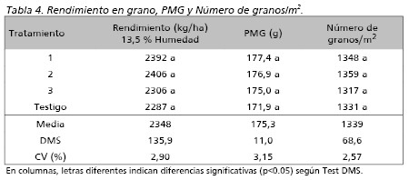 En la Tabla 4 se presentan los resultados de rendimiento, peso de mil granos (PMG) y Número de granos/m2 para todos los tratamientos.