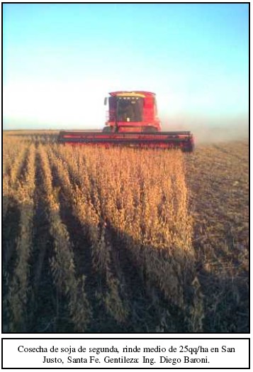 Por otra parte, el núcleo triguero del sur bonaerense presenta una importante reducción en la intención de siembra, debido a las alternativas que Cosecha de soja de segunda, rinde medio de 25qq/ha en San Justo, Santa Fe. Gentileza: Ing. Diego Baroni. busca el productor en la Cebada, Avena o Colza, como así también en no hacer un cultivo invernal y dejar preparado el potrero para encarar la campaña de gruesa con girasol o soja.
