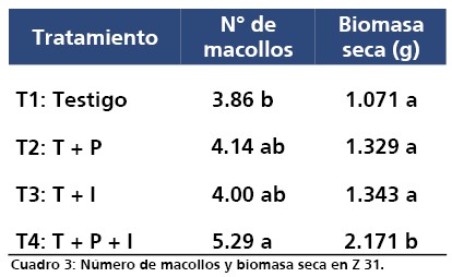Como se observa en el cuadro 3, el número de macollos promedio por planta mostró diferencias estadísticamente significativas entre el testigo y el tratamiento con fósforo y micorrizas. La biomasa seca por planta del tratamiento que tenía fósforo e inoculante se diferenció significativamente del resto de los tratamientos.