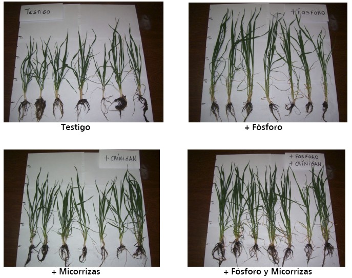 El uso de micorrizas en el cultivo de trigo en combinación con el fertilizante fosforado aumentó el número de macollos y la biomasa seca por planta a inicios de encañazón. Se observó un aumento promedio de rendimiento en los tratamientos inoculados del orden del 1.5%, aunque éste no fue estadísticamente significativo. Sin embargo, teniendo en cuenta el bajo costo de la técnica, con estas respuestas el retorno de dinero por peso invertido es interesante. Cabe destacar que la inoculación con micorrizas no reemplaza el uso de fertilizantes químicos, sino que es una tecnología complementaria al uso de los mismos.