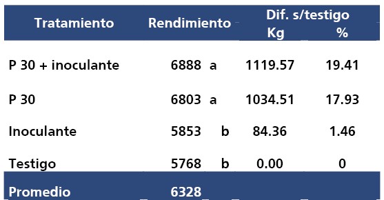 T4: Fósforo + Inoculante, fertilizado a línea de siembra con 110 kg de fosfato