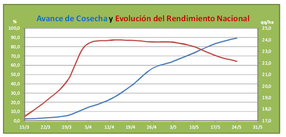 Con un rendimiento medio de 44,1 qq/ha, el volumen acumulado en chacra asciende a 2.23 Mtn. En la zona del centro, oeste y sudoeste bonaerense se registraron intensas lluvias que ocasionaron excesos hídricos y varios cuadros aun se pueden ver inundados. En esta región la cosecha se verá demorada hasta la recuperación de estos suelos anegados, además no pocos cuadros serán destinados al pastoreo directo en lugar de ser cosechado para grano.