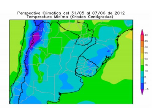 Al comienzo de la perspectiva se intensificará la entrada de vientos del sector sur iniciada en los días precedentes, provocando un marcado descenso de la temperatura, que se extenderá durante varios días abarcando gran parte del área agrícola nacional, provocando el riesgo de heladas en gran parte de la misma.