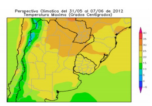 Al comienzo de la perspectiva se intensificará la entrada de vientos del sector sur iniciada en los días precedentes, provocando un marcado descenso de la temperatura, que se extenderá durante varios días abarcando gran parte del área agrícola nacional.