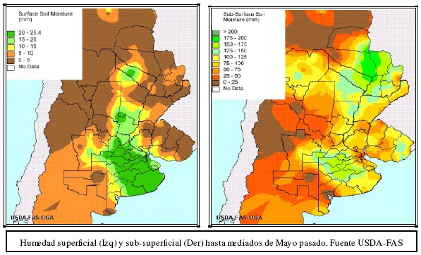 En todas estas zonas, la humedad es buena y en cuadros puntuales se observan excesos. Para los próximos días se espera tiempo frío y seco lo cual ayudaría al drenaje de estos lotes. Similar situación se da en el oeste y centro bonaerense, donde las excesivas precipitaciones ocasionaron inundaciones, por lo que el clima que se pronostica para los próximos días también seria favorable para estas regiones anegadas.
