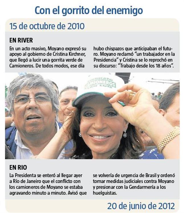 Hay otro indicio que para Cristina Kirchner demuestra la evidencia de un complot y es la generosa hospitalidad del canal TN, del Grupo Clarín, para con Moyano. Un detalle la enfurece: la primera vez que Néstor Kirchner tuvo entre las manos la frase "Clarín miente" fue cuando le arrebató un cartelito al jefe de la CGT en la tribuna de un acto contra el campo. Para Kirchner fue una victoria secreta. Cuando se enteró de que sería Presidente, había confesado ante un grupo de íntimos: "Sólo temo a dos personas, Magnetto y Moyano".