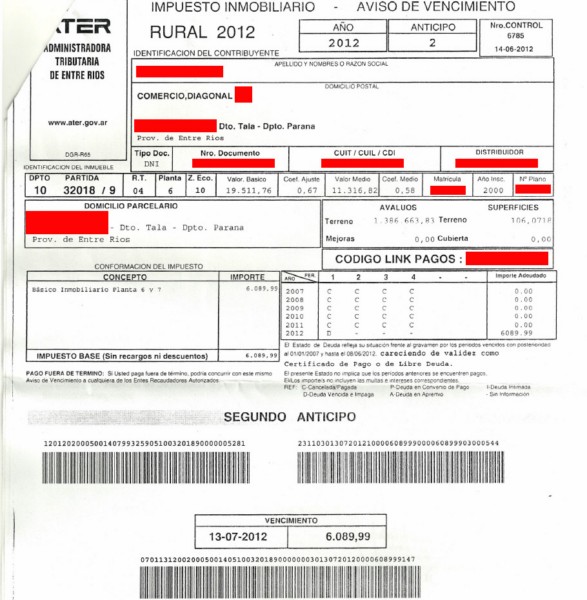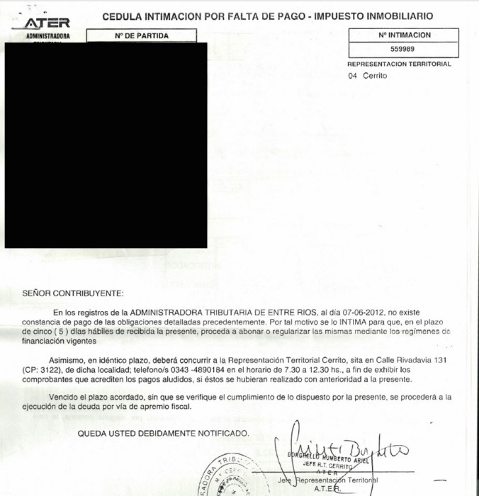 Por ende,los productores han sido intimados para que, "en el plazo de cinco días hábiles de recibida la intimación, procedan a abonar o regularizar las mismas mediante los regímenes de financiación vigentes. Vencido el plazo acordado,se procederá a la ejecución de la deuda por vía de apremio fiscal, según reza una cédula de intimación por falta de pago en el impuesto inmobiliario que recibimos desde la redacción de Agrositio.