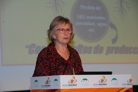 La experta señaló que el INTA promueve la rotación de soja con gramíneas, y mostró los resultados de experimentos sobre los efectos del monocultivo llevados a cabo en cuatro departamentos de la zona centro-sur de la provincia de Santa Fe, que presenta en el verano un 90% de su superficie sembrada con soja. Allí se comparó un “lote sojero” con un “lote rotado”, presentando el primero un nivel mucho mayor de compactación, menor porosidad, y una merma superior de los nutrientes.