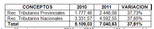 $850,51 millones, en 2011 $ 1.161,86, es decir un 36,6% más de lo transferido en el año anterior. Esto tiene relación con la evolución que han tenido el total de los recursos tributarios de la provincia de un año a otro, ya que el incremento fue del 37,81%: