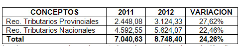 Es importante aclarar que la provincia coparticipa a municipios y comunas en forma directa el Impuesto Inmobiliario y Patente Única sobre Vehículos y en forma indirecta Ingresos Brutos, recursos del Régimen Federal y el Fondo Federal Solidario. La recaudación de estos impuestos han tenido una evolución favorable, si comparamos 2011 con 2012.