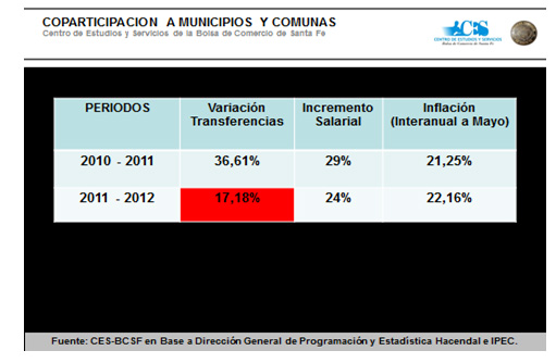 Ante esta situación el panorama para los municipios y comunas de la provincia en 2012 es el siguiente: las transferencias que recibieron se incrementaron en un 17,18%, pero enfrentaron un acuerdo salarial para los trabajadores municipales del 24% y la inflación interanual a mayo fue del 22,16%.