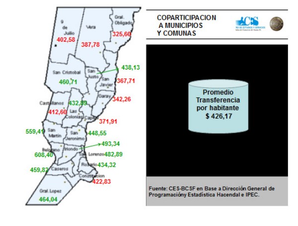 En siete de los diez departamentos del Centro Norte de la provincia las transferencias de recursos por parte del gobierno provincial por habitante, fueron inferiores al promedio de $ 426,17, siendo estos departamentos los que mayores demandas y dificultades enfrentan día a día. A modo de ejemplo, el departamento General Obligado recibió $ 325,60 por habitante.