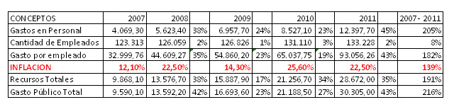 Es para destacar también que el gasto público total se incrementó un 216% desde 2007 a 2011, mientras que los recursos se incrementaron un 191%. En el mismo período el gasto en personal se incrementó un 205%, y la cantidad de empleados creció un 8%, de 123.313 agentes a diciembre de 2007, llegamos a 133.228 a diciembre de 2011.