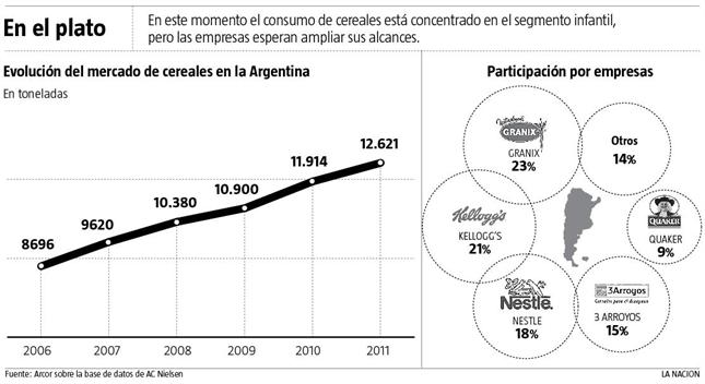 De acuerdo con los datos de la consultora AC Nielsen, el segmento es liderado por la empresa Granix -controlada por la Iglesia Adventista- que tiene una participación de mercado del 23%, seguido por las filiales locales de las multinacionales Kelloggs, con 21%, y Nestlé, con 19 por ciento. El pelotón de las compañías líderes se completa con las firmas 3 Arroyos y Quaker (del grupo Pepsico), que juntas controlan otro cuarto de las ventas.