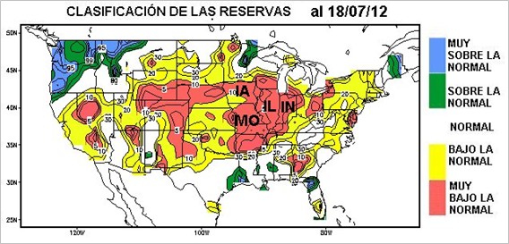 La imagen es muy elocuente. Cuatro de los estados más importantes del Corn Belt, se ubican en la categoría más baja de la escala. Illinois (IL), se ubica en el epicentro de la seca y los estados vecinos completan una zona muy homogénea donde las reservas de humedad son exiguas, de sequía plena. Hace casi 25 años que no se observa una campaña tan marcada por las deficiencias hídricas, no al menos con un impacto tan conspicuo sobre el corazón de la zona núcleo.
