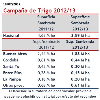 Si bien los guarismos de superficie del trigo 2012/2013 seguirán revisándose mensualmente, hasta llegar a la configuración final, en el presente informe se estima un área total de 3,59 millones de hectáreas, lo cual es un 22,5% inferior a los 4,63 millones de hectáreas cultivadas en la campaña anterior.