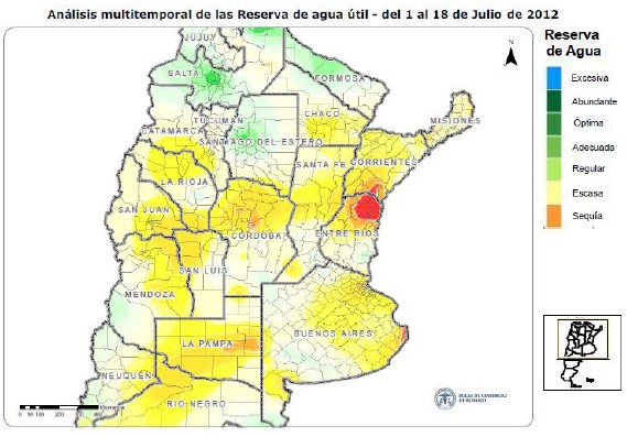 En lo que se refiere a la provisión de agua de la provincia de Córdoba se nota una gran división entre el sec-tor norte y sur, lo cual puede apreciarse en la imagen de agua en el suelo para el mes de julio del 2012. Pero, incluso en el sector más favorecido, como, por ejemplo, los departamentos de Marcos Juárez y Unión, se estima una baja de superficie de un 43%, o en la zona de Rio Cuarto, donde la baja estimada es de un 21%. Sólo en el área de Laboulaye se espera que no haya importantes variaciones respecto al año anterior. A ni-vel provincial, se proyecta una disminución de un 27% del área triguera cordobesa respecto de la campaña predecesora.