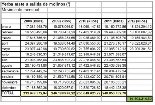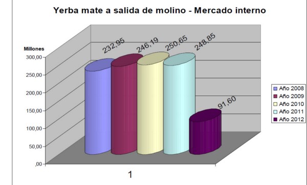 En el Informe mensual del sector yerbatero, correspondiente a mayo de 2012, el Instituto Nacional de la Yerba Mate (INYM), relevó un mayor kilaje de yerba mate elaborada a salida de molino, pero en cuanto a mercado interno, la yerba salida a molino, para el periodo enero – mayo 2012 al momento, totaliza 91.603.314,30 kilos, mientras que en 2011 la producción total había sido de 248,85 millones de kilos. Por ende, si este ritmo de menor producción en kilaje se mantiene hasta diciembre de 2012, se produciría menos yerba mate y por ende subiría su precio en góndola.