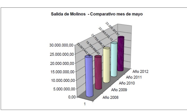 En cambio, en la comparativa que el INYM realiza datos estadísticos registrados durante mayo del año 2.012 y en el mismo mes pero de años anteriores, el volumen de yerba mate elaborada a salida de molino fue mayor que en otros años; pasó en mayo del corriente año a poco más de 23 millones de kilos, mientras que a mayo de 2011, ese volumen no llegaba aún a los 23 millones de kilos. De cualquier modo, la ganancia en comparación es leve.