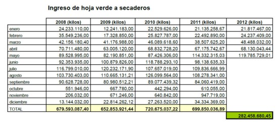 El ingreso de materia prima a los establecimientos de secanza permite observar el avance de la cosecha en la región productora. Los datos indican que entre los meses de enero y mayo fueron procesados 282.458.680,45 kilos de hoja verde.