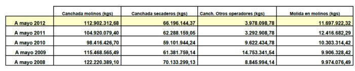Para el primer caso se observan tres variantes: el stock de canchada en secaderos, en molinos y en poder de otros operadores. Los datos refieren que en mayo de l 2.012 existía en secaderos un stock de 66.196.144, 37 kilos de canchada, mientras que los molinos contaban con un stock de 112.902.312, 68 kilos de canchada.