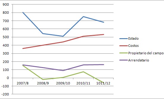propietario del campo le queda alrededor del 45 % del ingreso original.